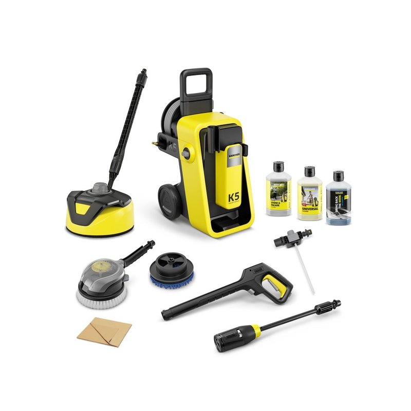 Aparatul de spălat cu presiune K 5 Comfort Premium Car & Home, cu randament de curățare de 40 m²/h, motor răcit cu apă, furtun PremiumFlex și tambur pentru furtun. Include Car Cleaning Kit și Home Kit.