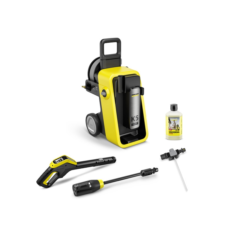 Aparatul de spălat cu presiune K 5 Comfort Premium Connect este echipat cu un motor durabil, răcit cu apă, care asigură performanță constantă, iar tamburul convenabil pentru furtun, cu furtun PremiumFlex, oferă flexibilitate maximă. Pistolul de pulverizare G 180 Q Comfort Connect reduce vizibil forța necesară pentru menținerea apăsată a trăgaciului, permițând un lucru confortabil și fără oboseală. Afișajul LCD al pistolului oferă 3 niveluri de presiune, inclusiv eco!Mode și 2 niveluri de detergent, adaptate diferitelor sarcini de curățare. Reglajul nivelului direct pe pistol îmbunătățește și ergonomia în timpul utilizării. Datorită sistemului Quick Connect, furtunul de înaltă presiune poate fi conectat rapid și fără efort, iar lancea inovatoare Multi Jet 4-în-1 combină patru tipuri de jet, care pot fi reglate comod prin simpla rotire a capului lancei. Mai mult, conceptul de detergent 2-în-1 asigură confort suplimentar și aplicarea optimă a detergentului, adaptată fiecărei sarcini. Presiunea poate fi ajustată direct de pe smartphone, prin conexiunea Bluetooth la aplicația Kärcher Home & Garden, care oferă și consultant de aplicații integrat, precum și sfaturi și trucuri utile.