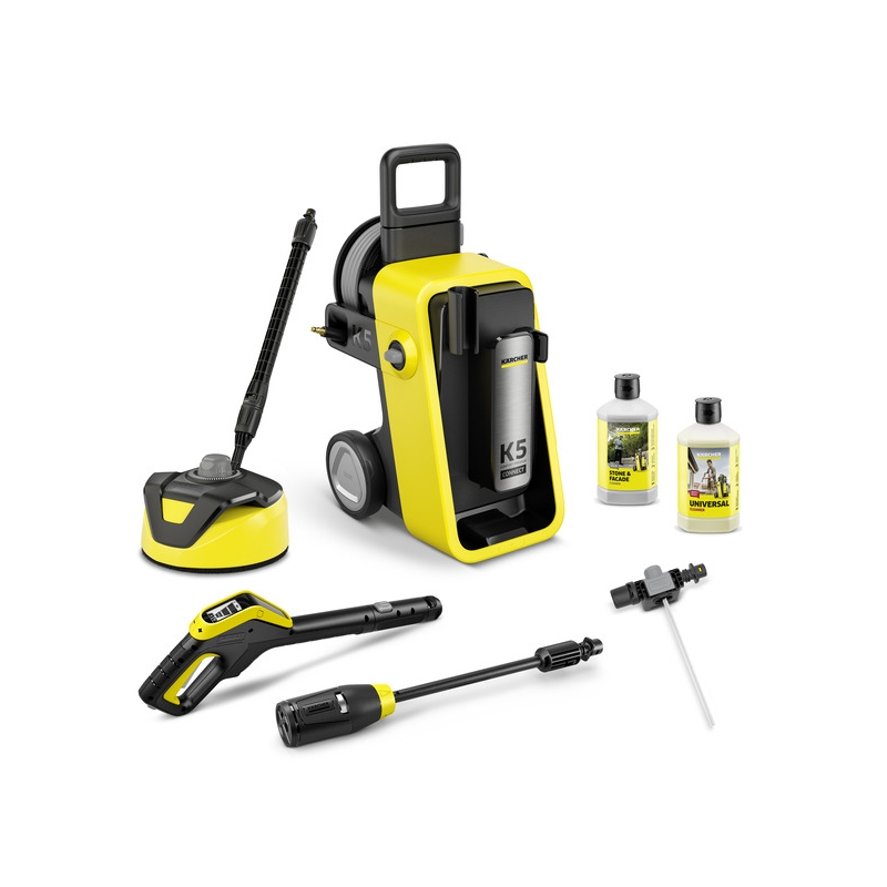 Aparatul de spălat cu presiune K 5 Comfort Premium Connect Home este echipat cu un motor durabil, răcit cu apă, care asigură performanță constantă, iar tamburul convenabil pentru furtun, cu furtun PremiumFlex, oferă flexibilitate maximă. Include Home Kit, cu dispozitiv de curățare a suprafețelor T 5 și 1 litru de detergent pentru piatră și fațade. Pistolul de pulverizare G 180 Q Comfort Connect reduce vizibil forța necesară pentru menținerea apăsată a trăgaciului, permițând lucru fără oboseală. Afișajul LCD al pistolului oferă 3 niveluri de presiune, inclusiv eco!Mode și 2 niveluri de detergent, adaptate diferitelor sarcini de curățare. Reglajul nivelului direct pe pistol îmbunătățește ergonomia în timpul utilizării. Datorită sistemului Quick Connect, furtunul de înaltă presiune poate fi conectat rapid, iar lancea inovatoare Multi Jet 4-în-1 combină patru tipuri de jet, care pot fi setate prin simpla rotire a capului lancei. În plus, conceptul de detergent 2-în-1 oferă confort suplimentar și aplicare optimă a detergentului, adaptată fiecărei sarcini. Presiunea poate fi ajustată direct de pe smartphone, prin conexiunea Bluetooth la aplicația Kärcher Home & Garden, care oferă și consultant de aplicații integrat, precum și sfaturi și trucuri utile.